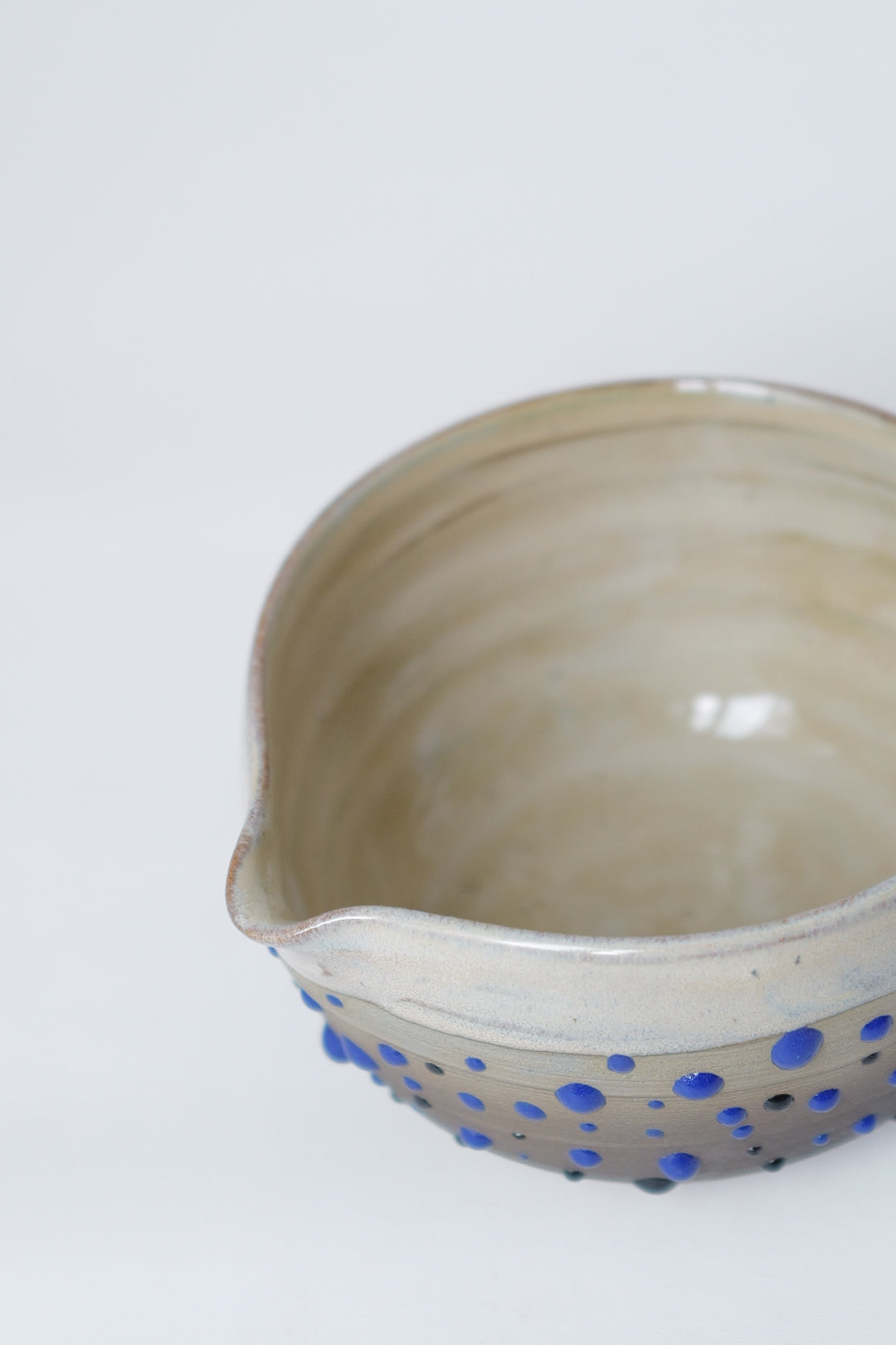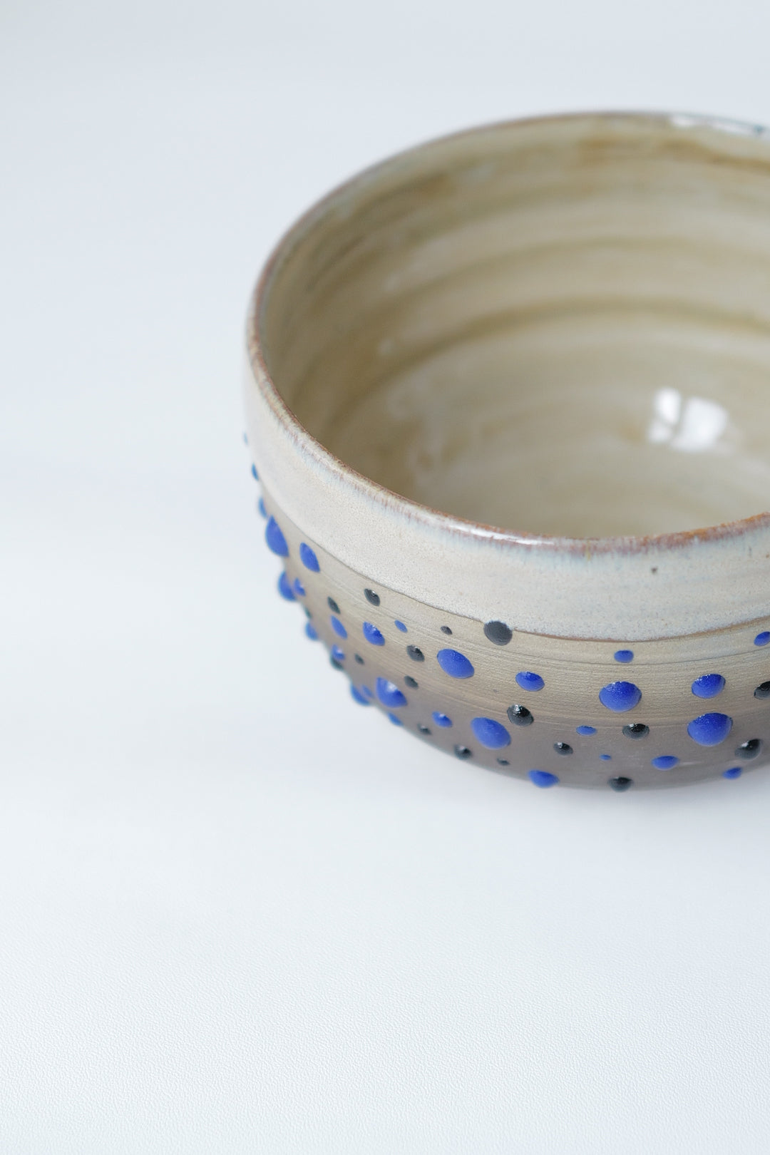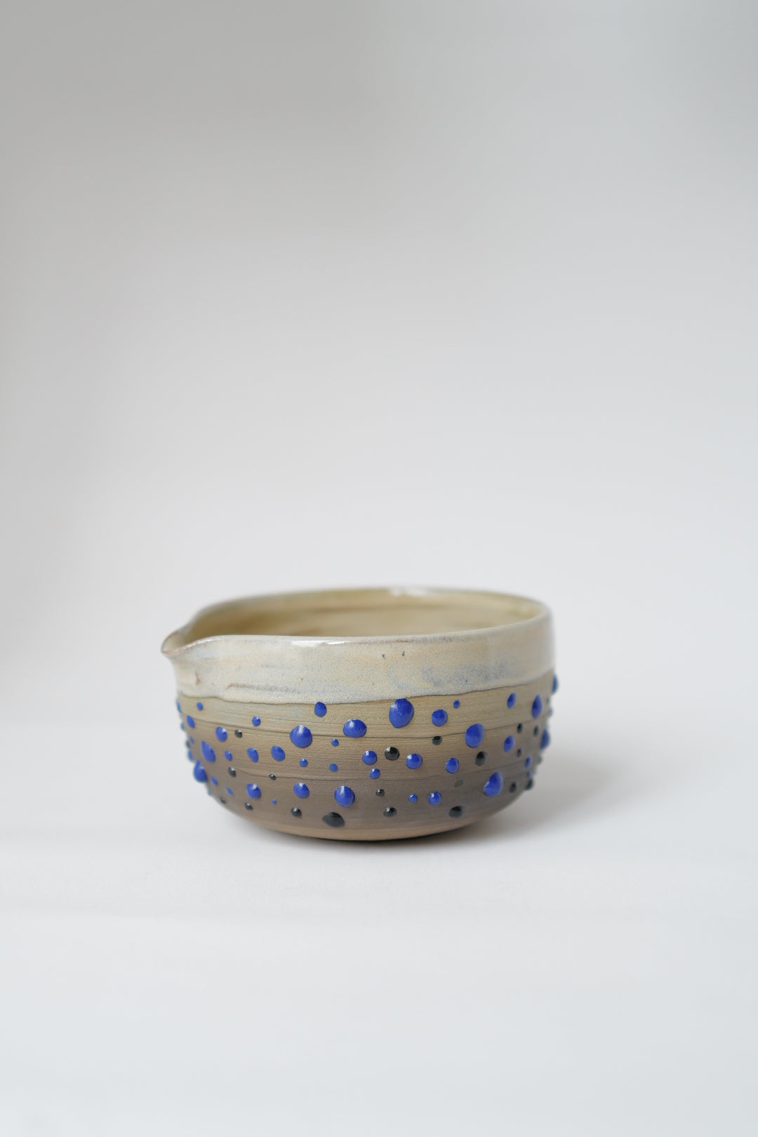 A wheel-thrown matcha bowl capturing the quiet rhythm of raindrops. The soft beige clay body contrasts with hand-applied blue and black droplets, forming a serene pattern that feels alive yet still. Designed for daily rituals — pouring matcha, sauces, or simply holding stillness in your hands