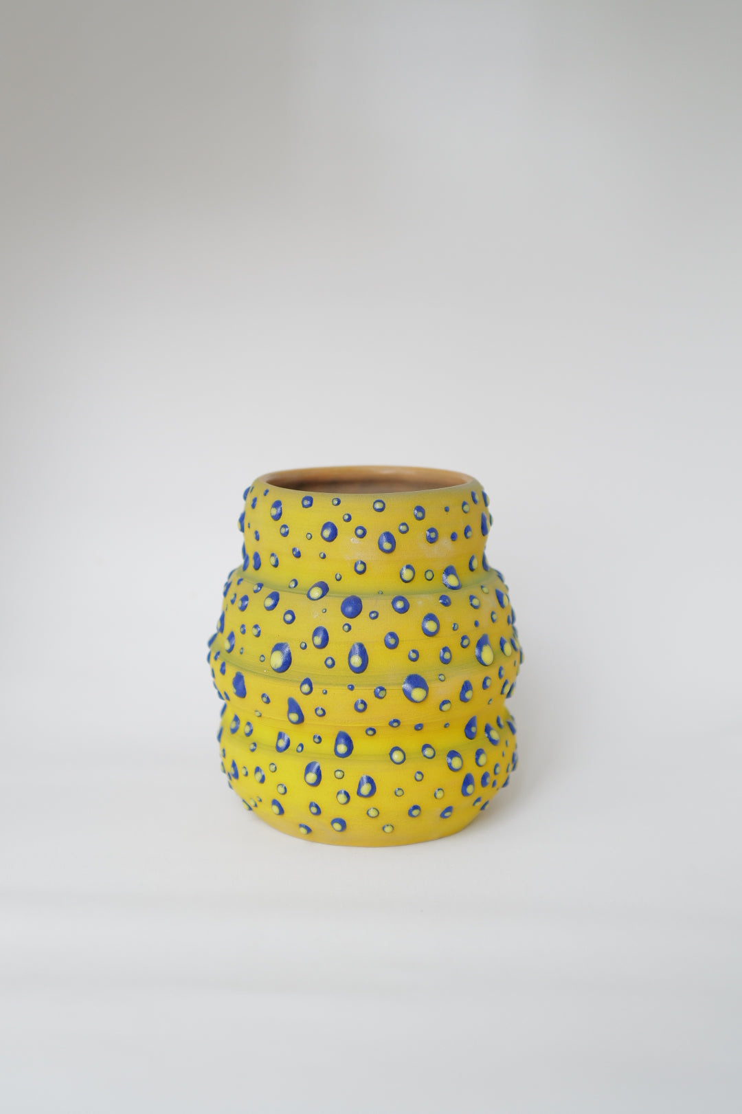This bright yellow vessel captures the moment when sunlight meets rain — cheerful yet calm. The rhythmic blue drops wrap the form like a pattern of falling joy, each dot carefully applied by hand. A playful contrast of warmth and coolness, representing optimism after the storm.