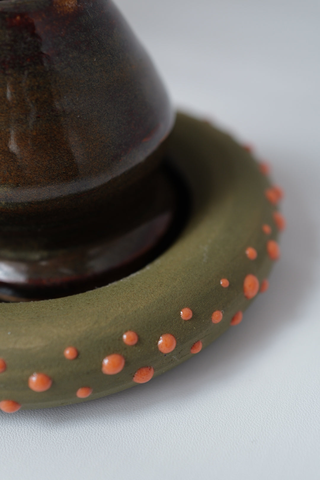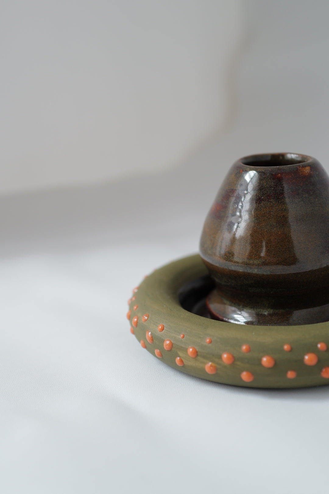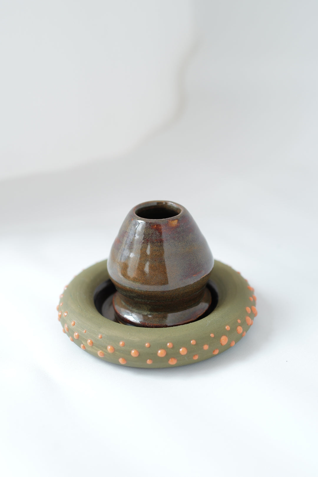 A handcrafted matcha whisk holder paired with a matching coaster. The holder features a glossy, earthy glaze with subtle maroon hues, while the ring-shaped coaster is finished in matte olive with playful coral dot accents. Functional yet artistic, this set keeps your chasen in shape while adding texture and color to your tea ritual.
